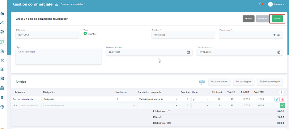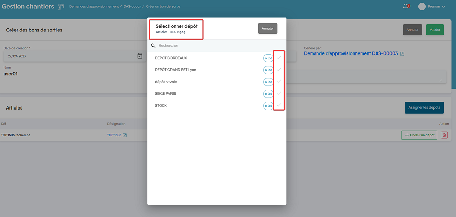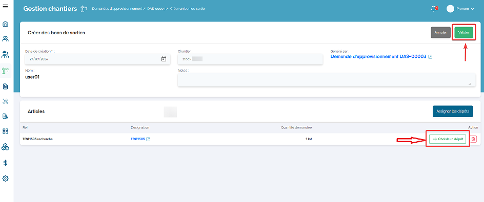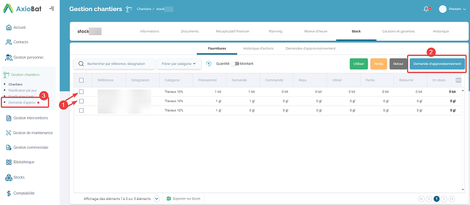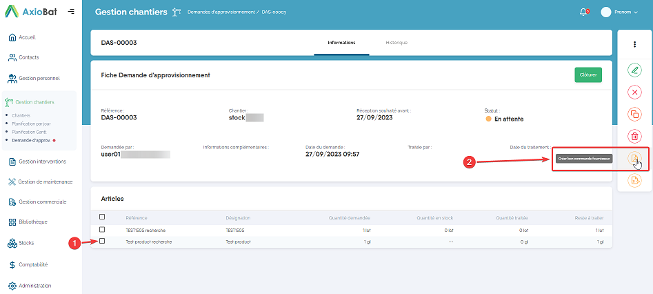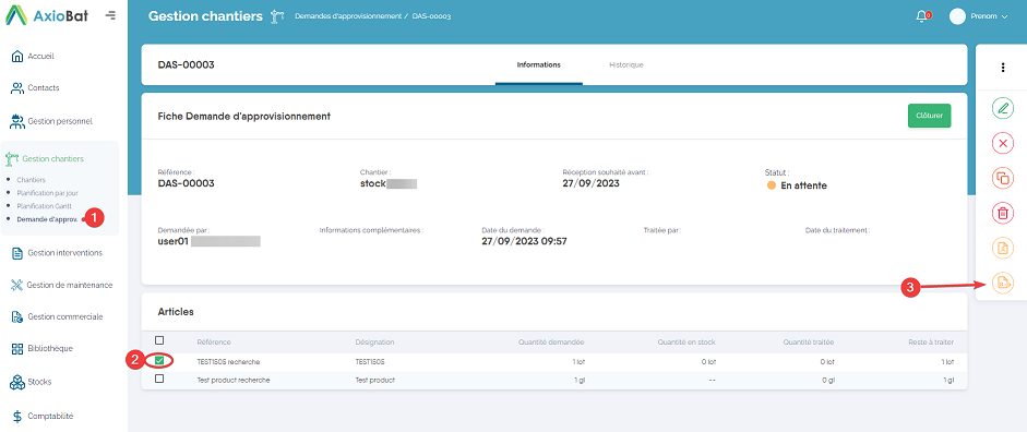 - Automatiquement, la demande d'approvisionnement apparait sur la section demande d'approvisionnement au niveau Gestion chantier