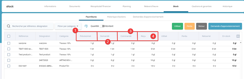 - Prévisionnel : Représente la quantité des articles existant sur les devis associés au chantier (Accepté/signé)