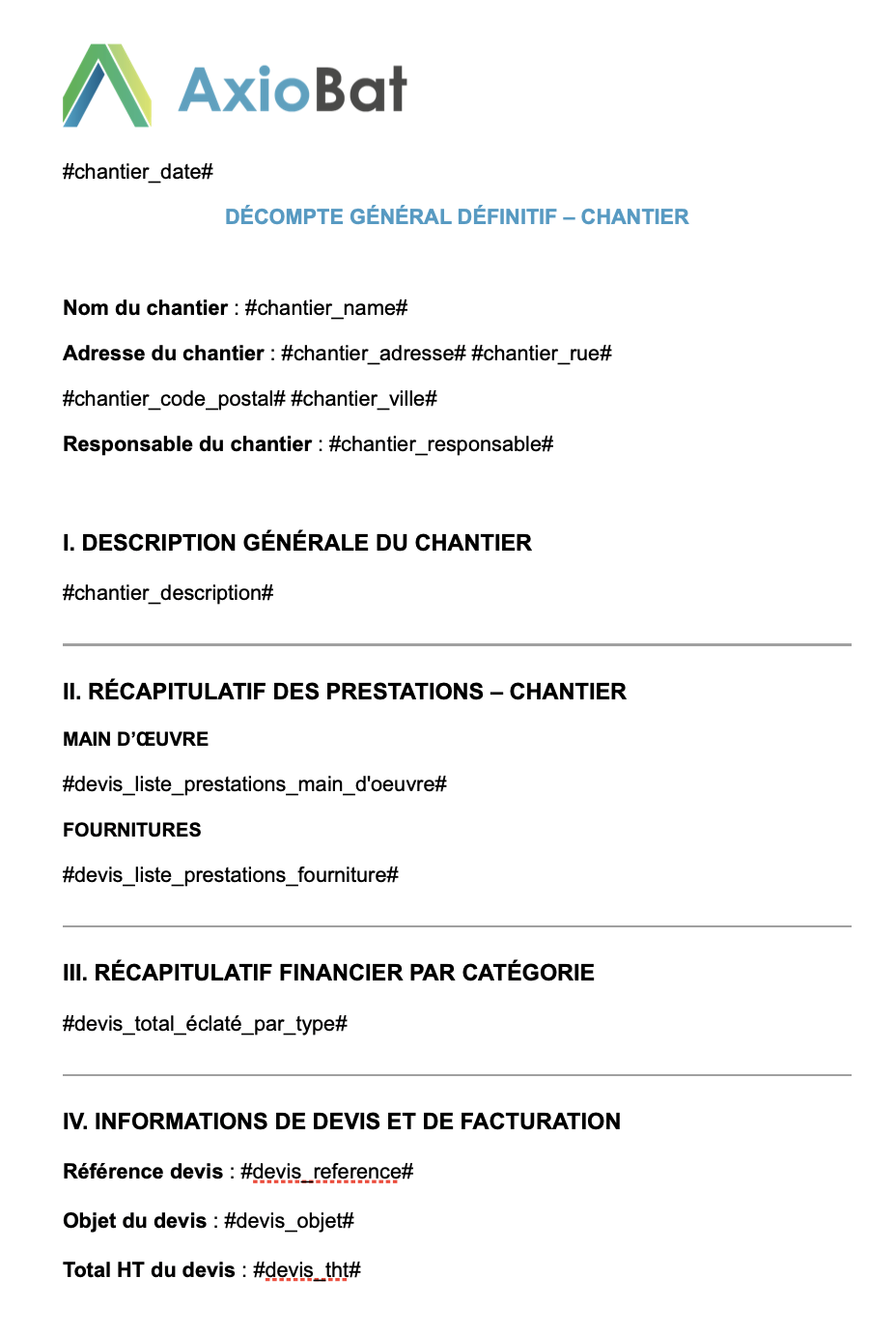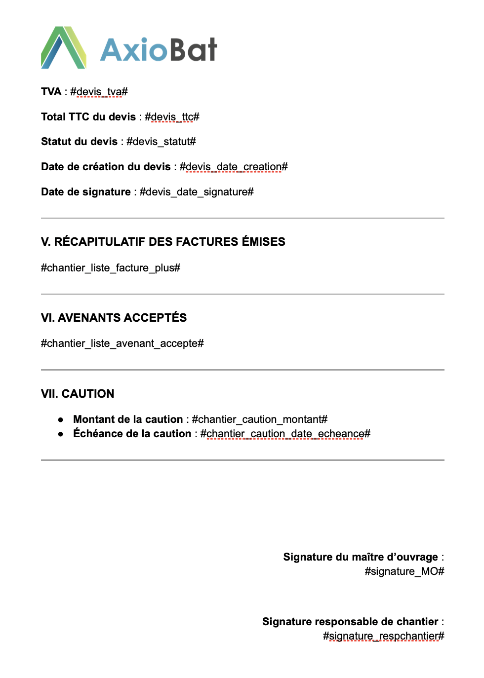 💡Vous pouvez utiliser plus de 180 balises (client, chantier, devis, facture, etc.), toutes déjà liées à vos données centralisées dans Axiobat.
