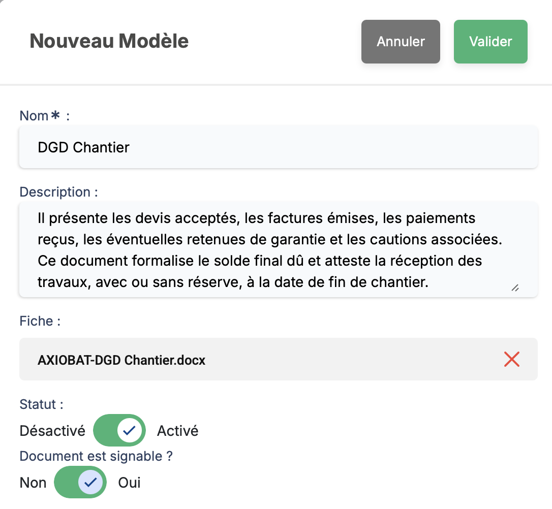 Activer le modèle : cochez si vous souhaitez qu’il soit disponible immédiatement.