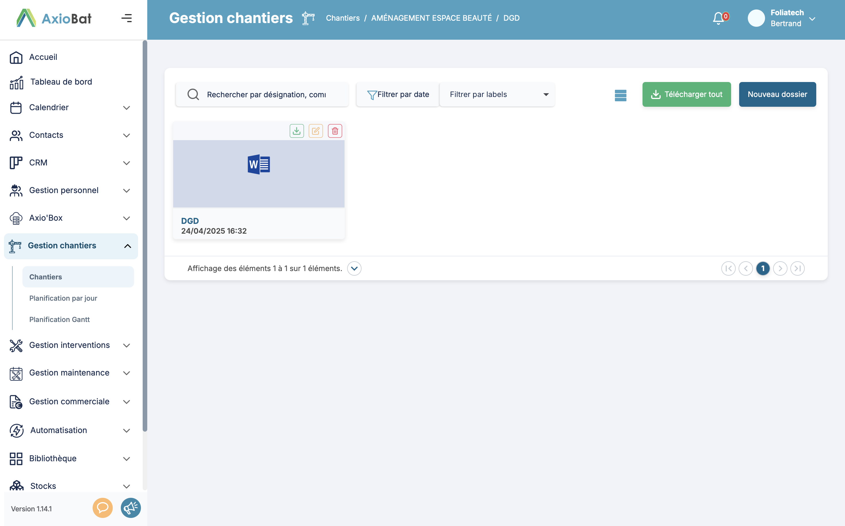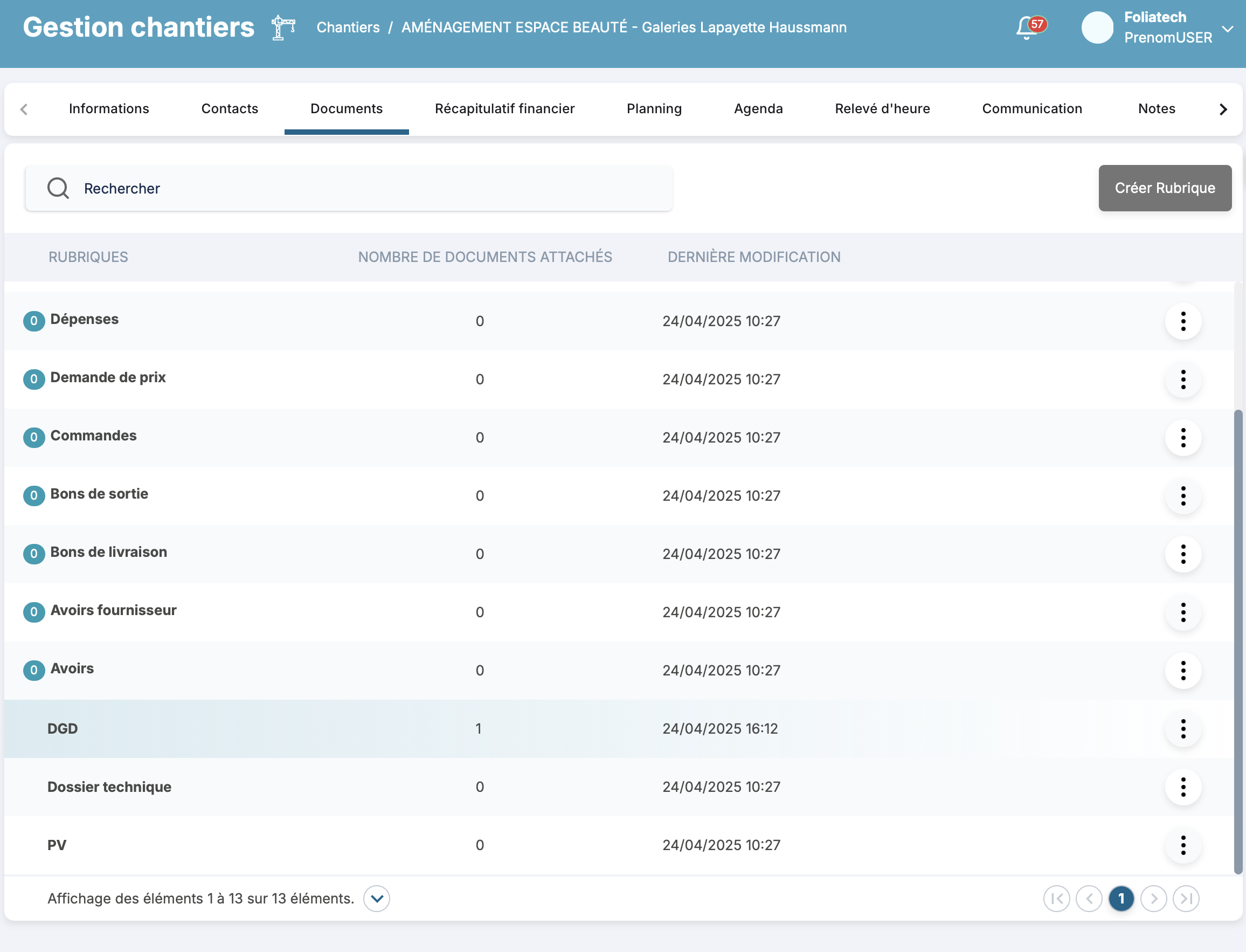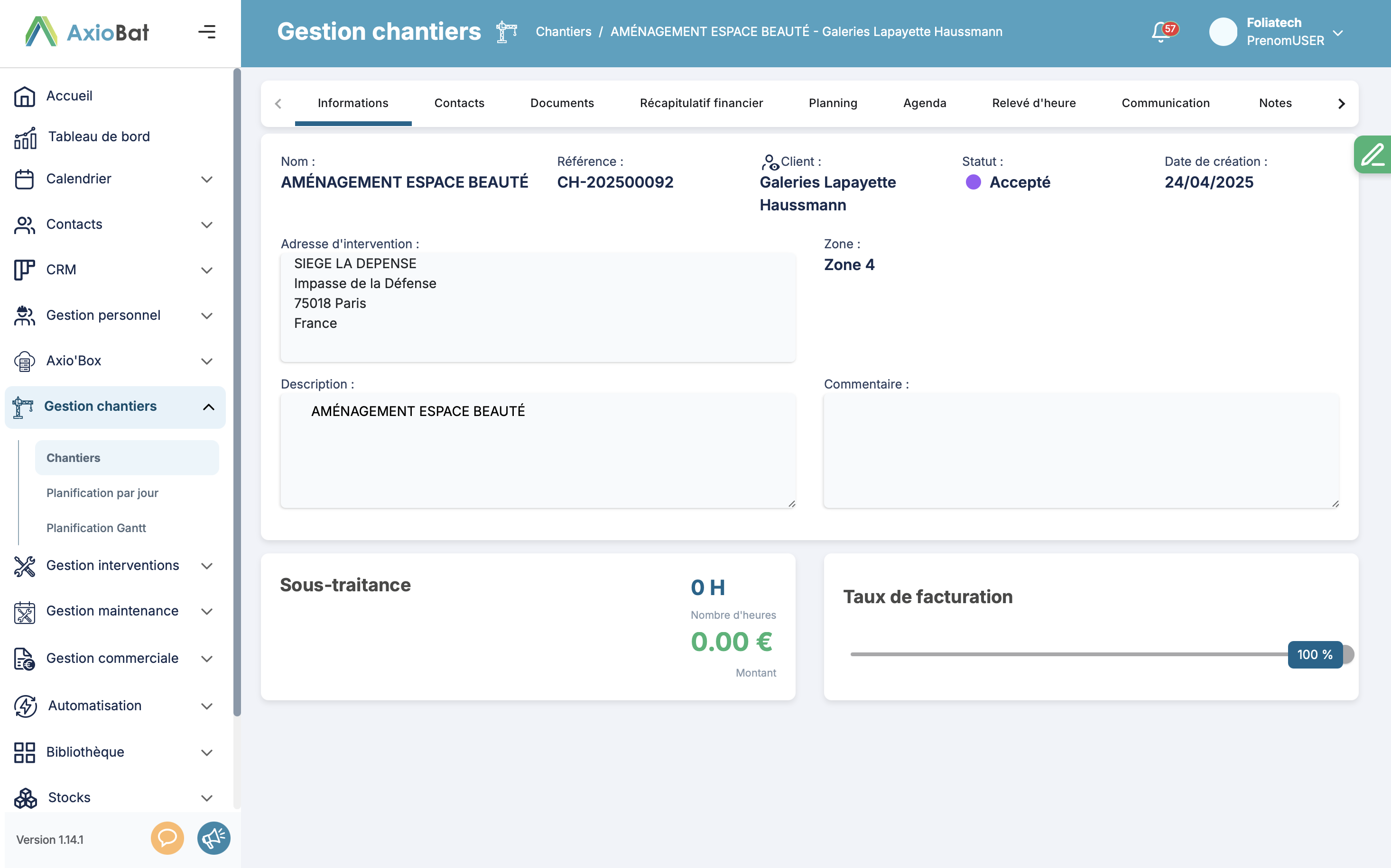 Dans le module Gestion Chantiers ➡️ Chantiers, utilisons l'exemple du chantier Aménagement espace beauté pour un client fictif Galeries Lapayette Haussmann qui a été "accepté".