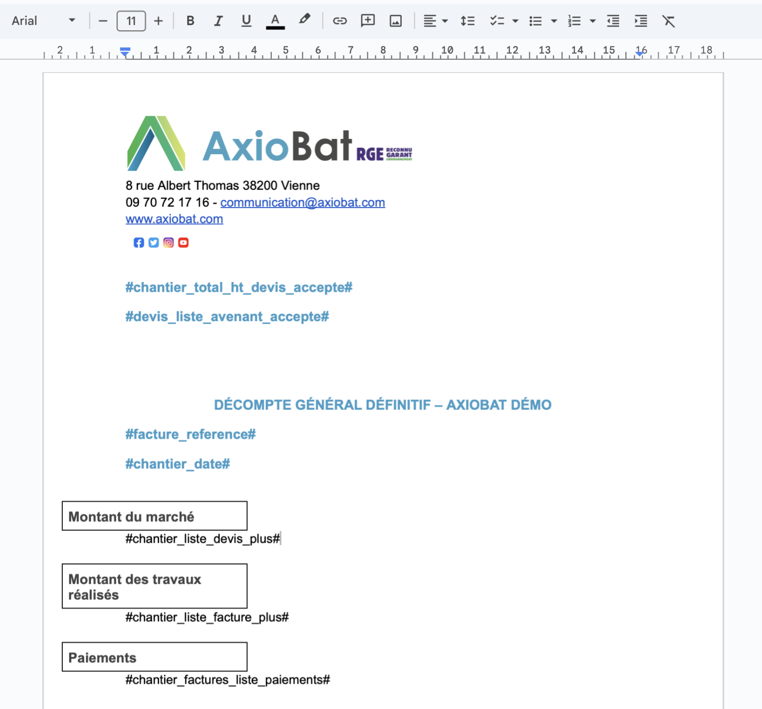 , comportant les balises dynamiques nécessaires à la génération automatique des données depuis Axiobat.
