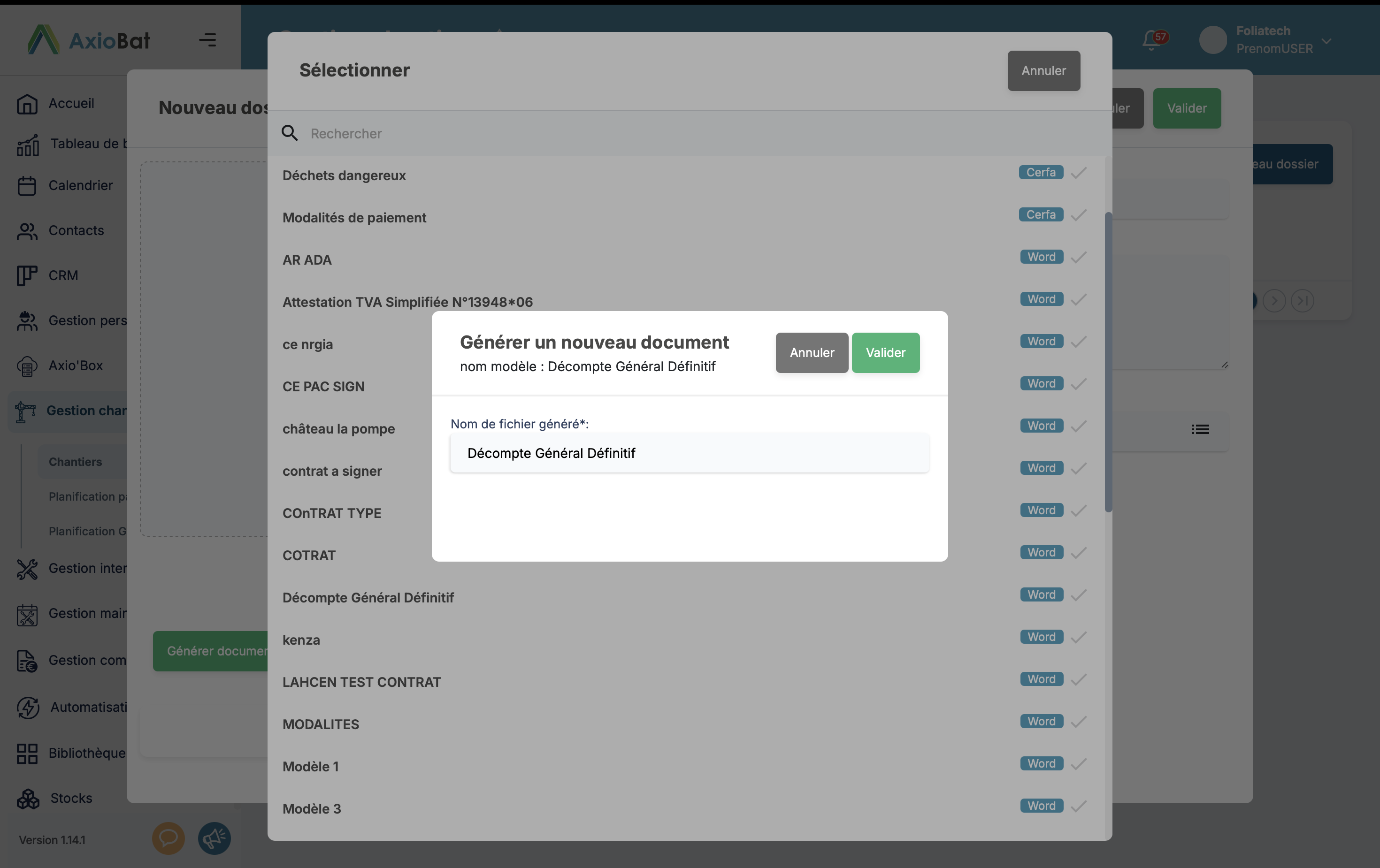 Sélectionnez le modèle de document, dans notre exemple le décompte général définitif puis cliquez sur le bouton vert "valider" :