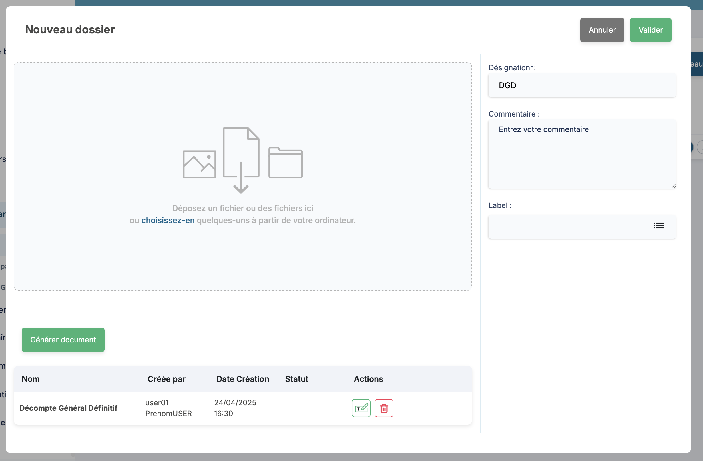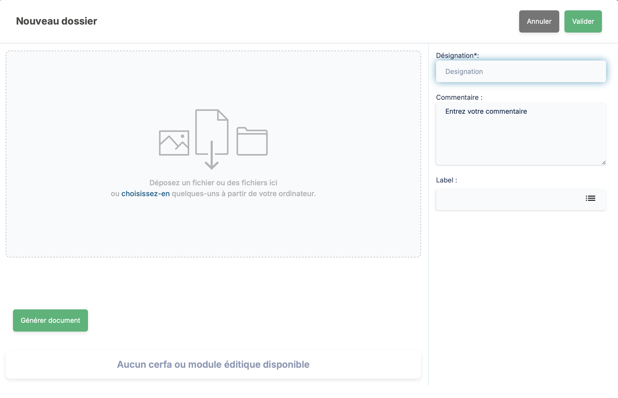 Cliquez sur le bouton en haut à droite "Valider" pour enregistrer votre nouveau dossier.