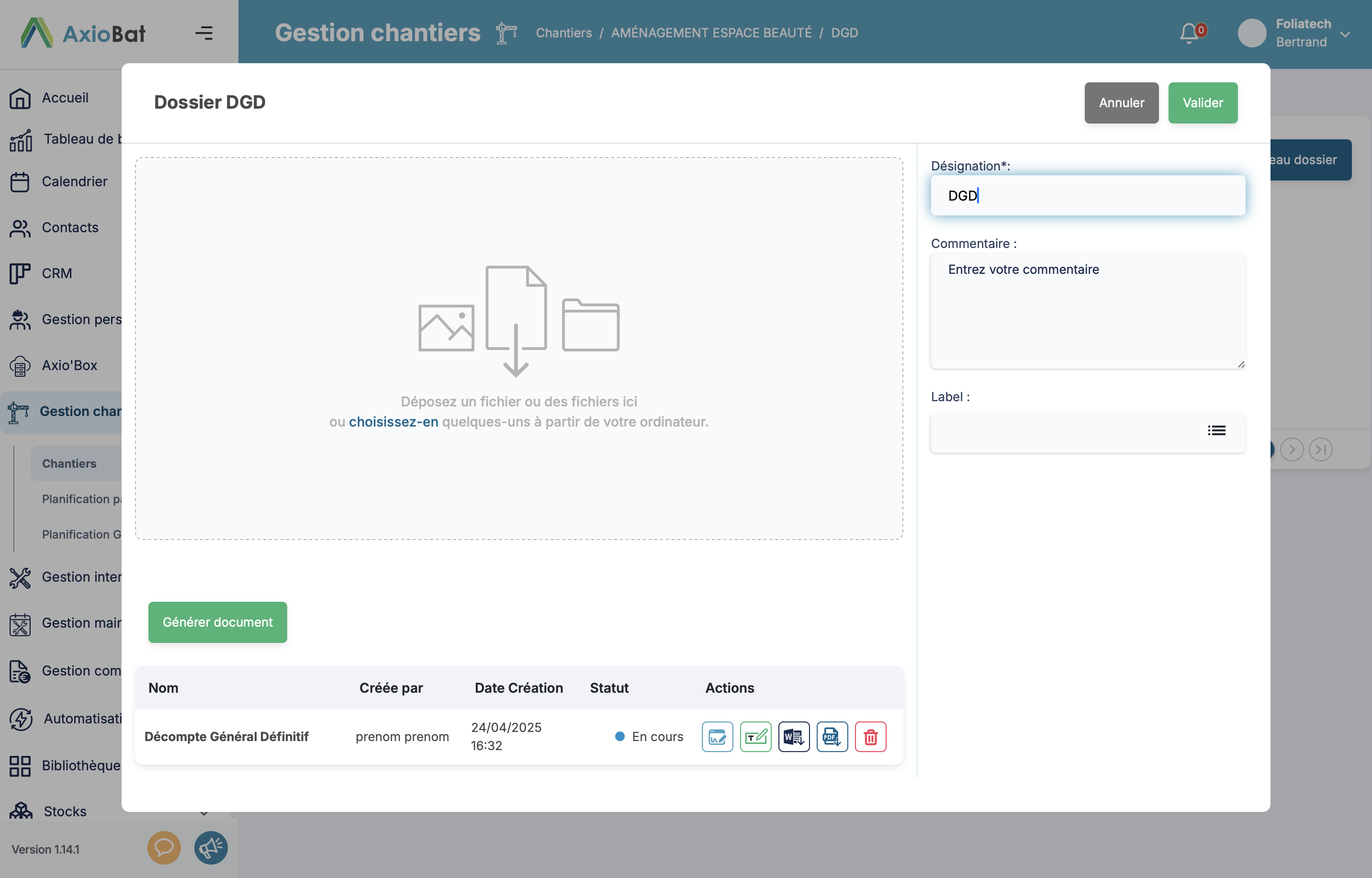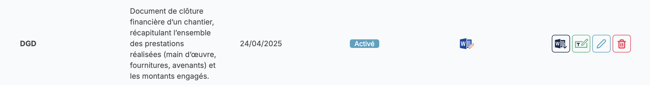 En cliquant sur la vignette du DGD, vous accédez au document généré, avec le détail de son auteur, la date de création, son statut et un menu d’actions associé.