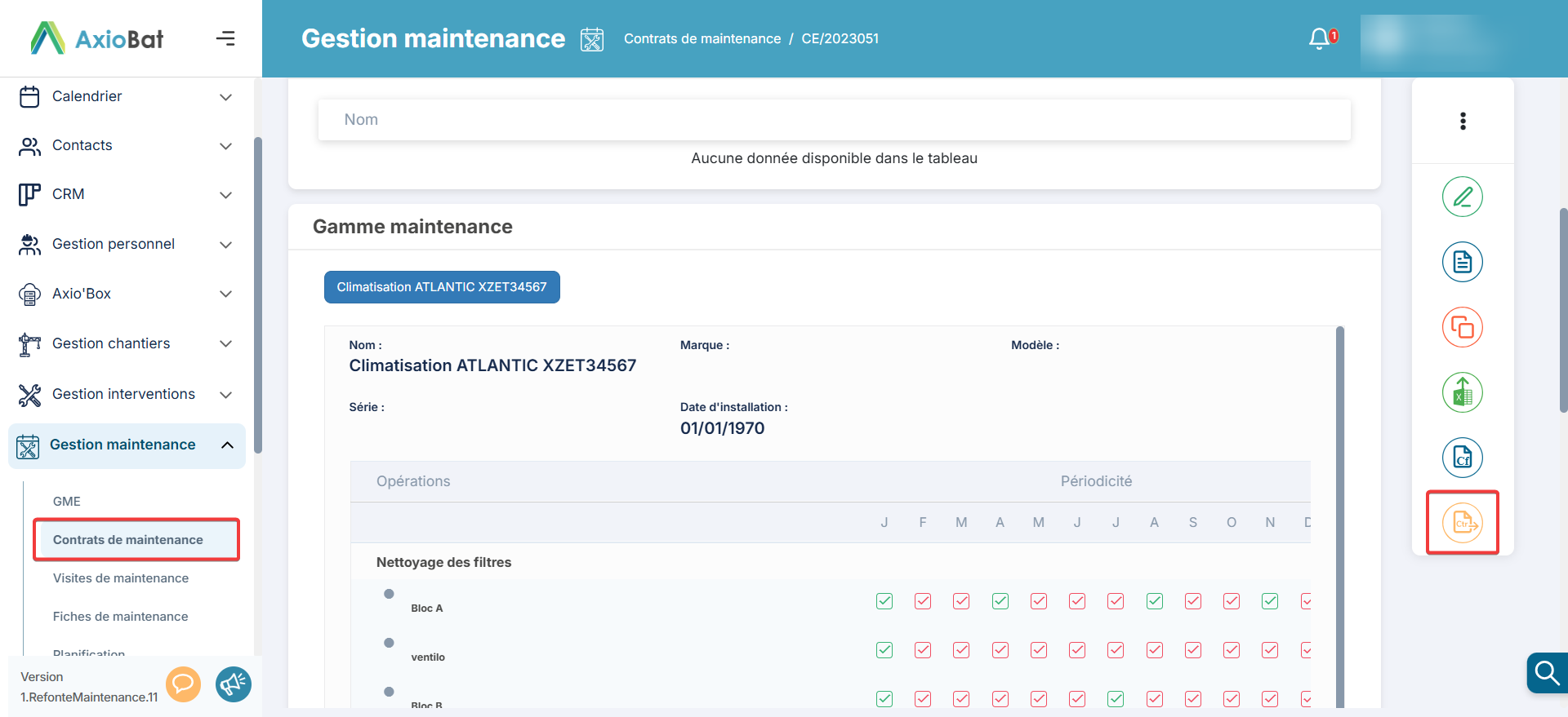 Cette action facilite la transition vers la nouvelle version sans perte des données clés, tout en permettant d’enrichir le contrat avec les nouvelles informations disponibles dans le nouveau module de gestion de maintenance.