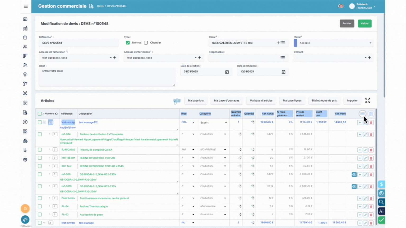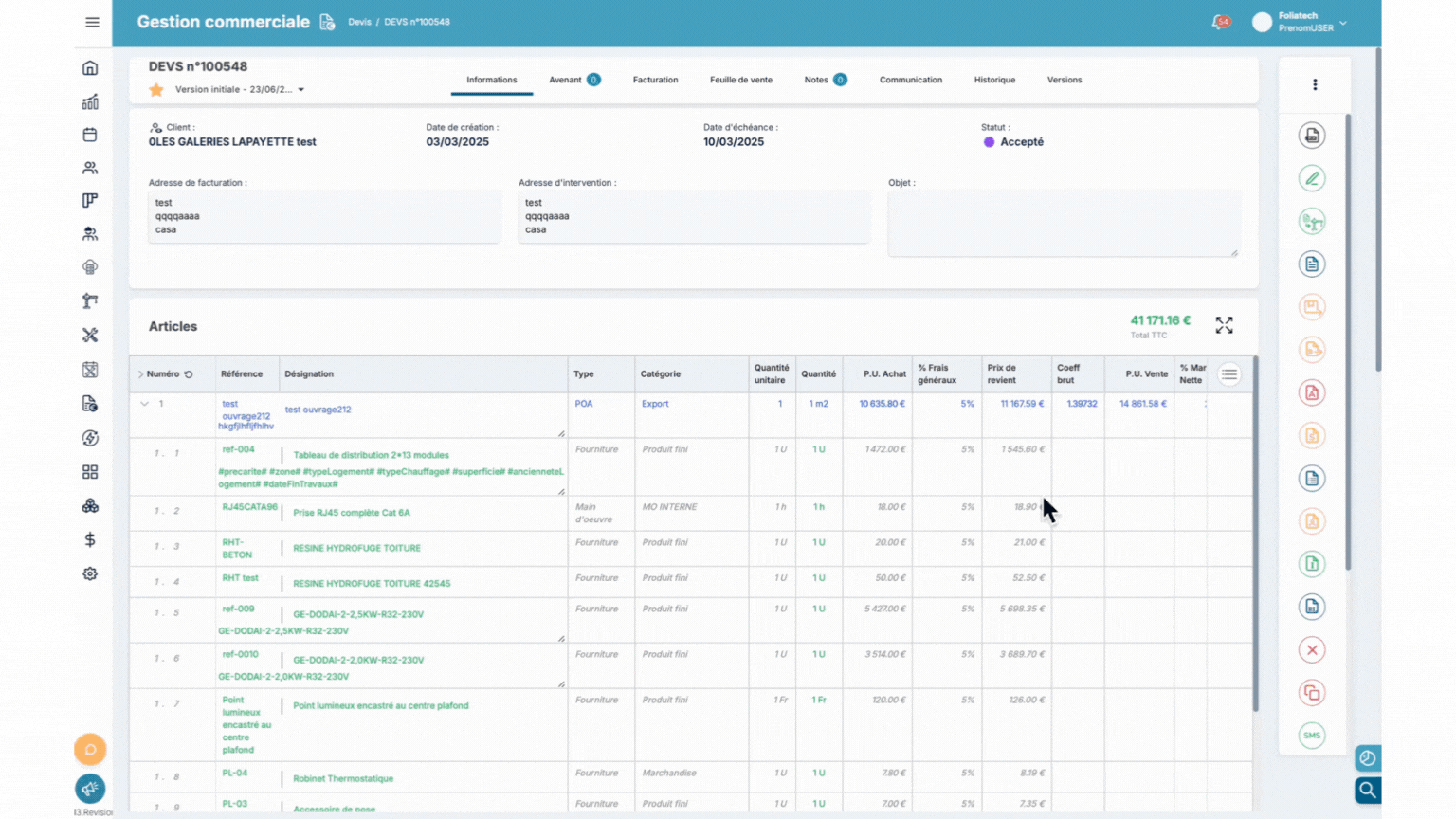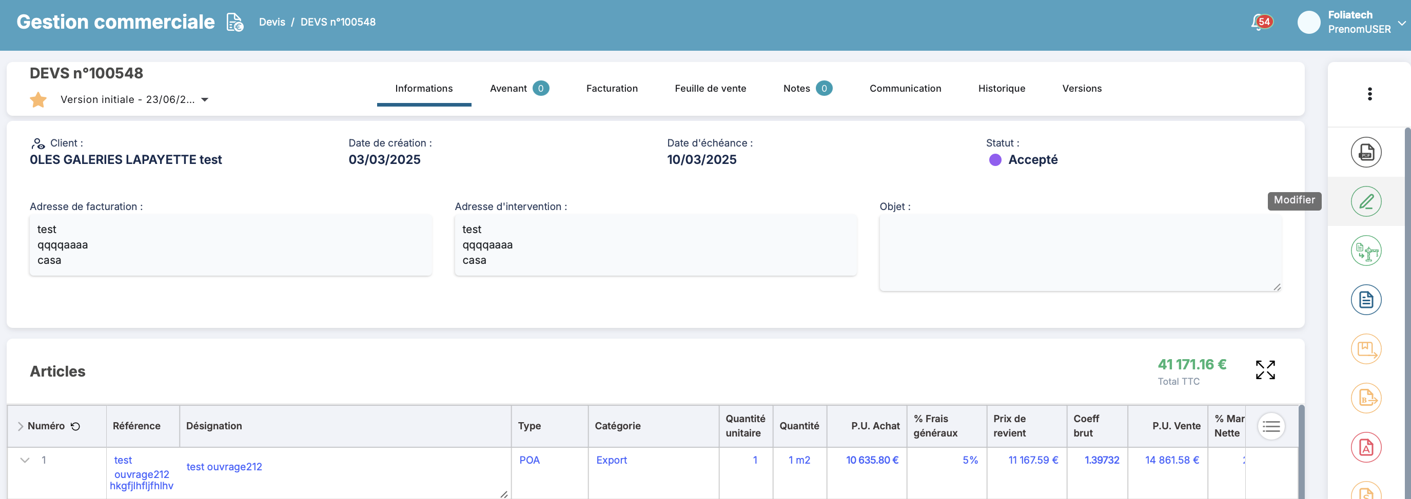 Dans le cadre de la refonte de la table de chiffrage, plusieurs améliorations ont été apportées, tant sur le plan visuel que fonctionnel. Rendez-vous dans le module Gestion commerciale, sur un devis, cliquez sur le bouton Modifier (à droite).