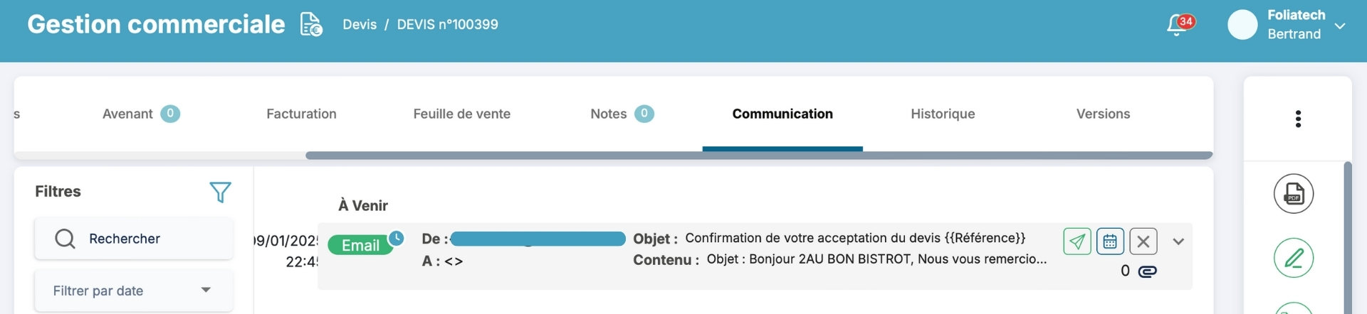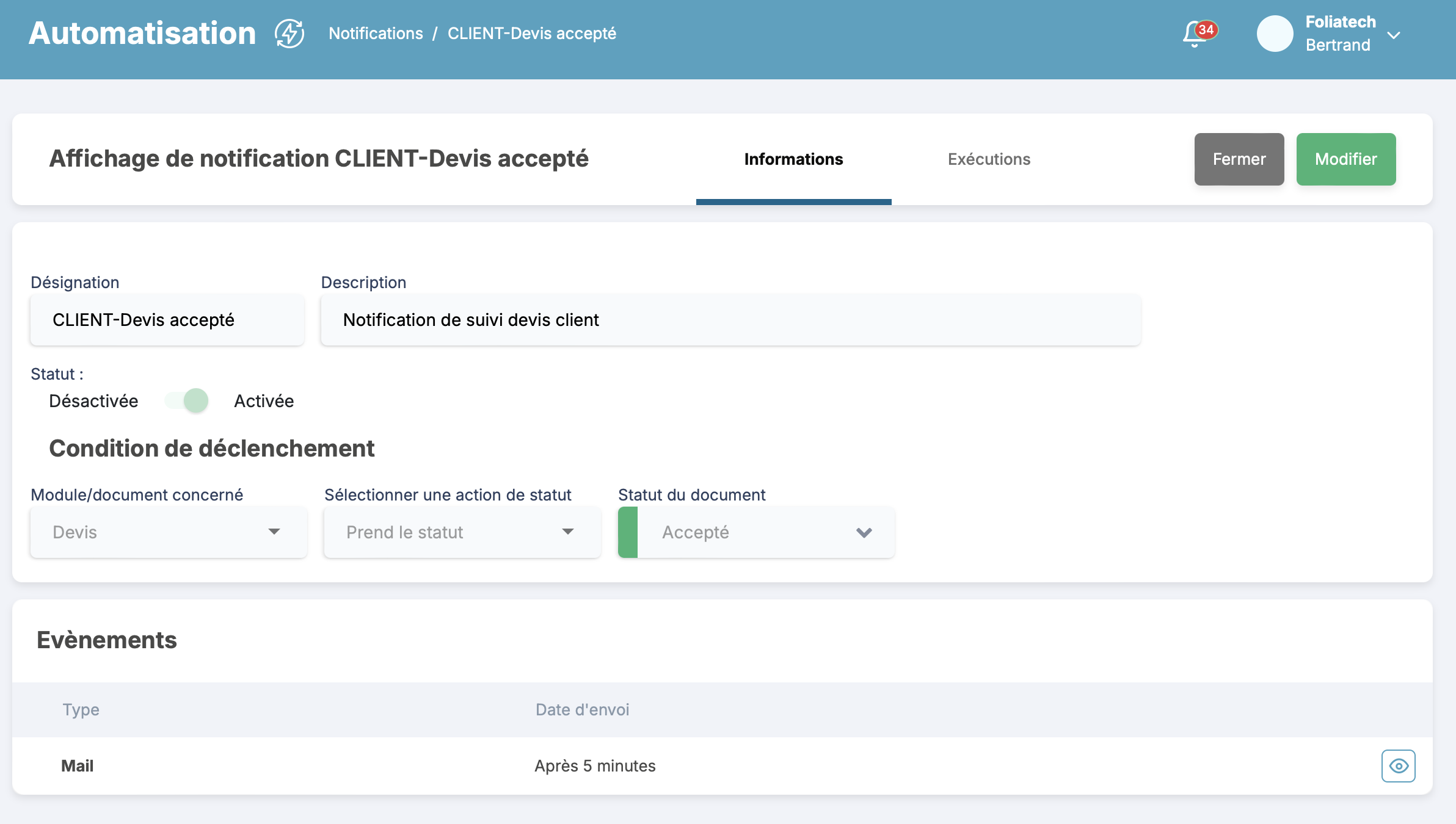 Nous allons prendre un exemple : pour informer automatiquement un client par email lorsque son devis passe au statut "Accepté".