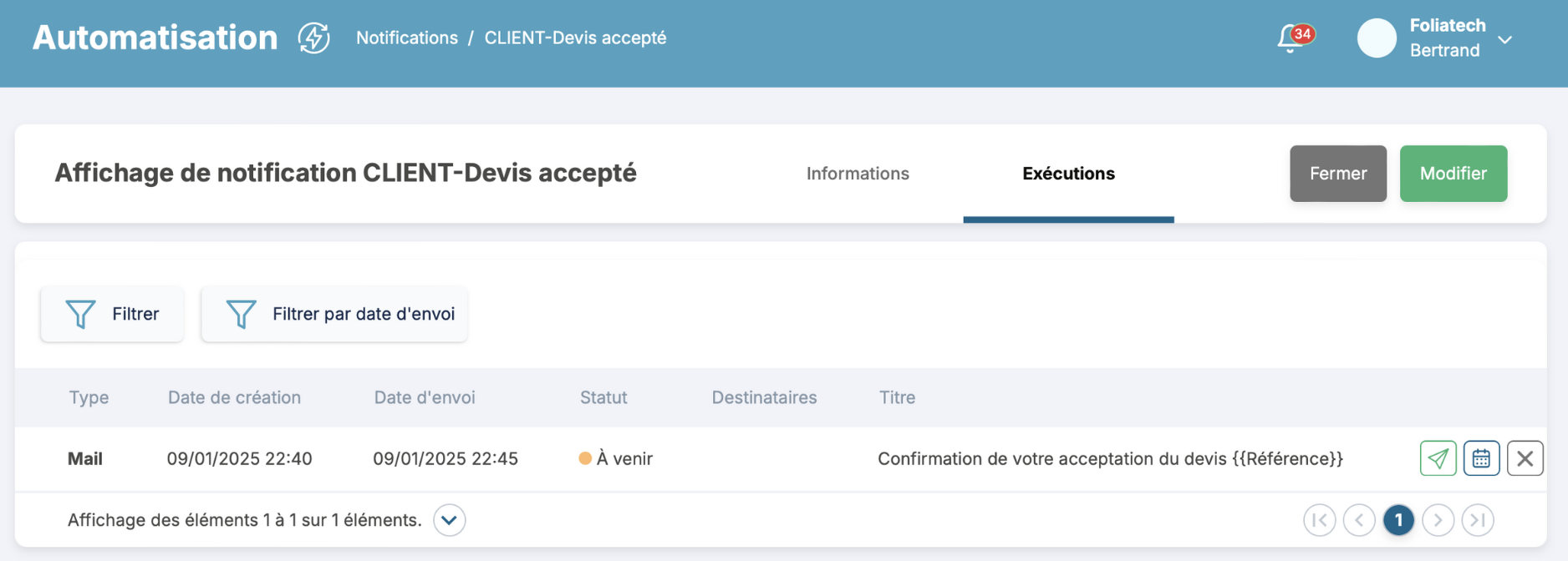 Ensuite, vous retrouvez également une traçabilité des notifications dans Automatisations > Notifications > cliquez sur Visualiser.
