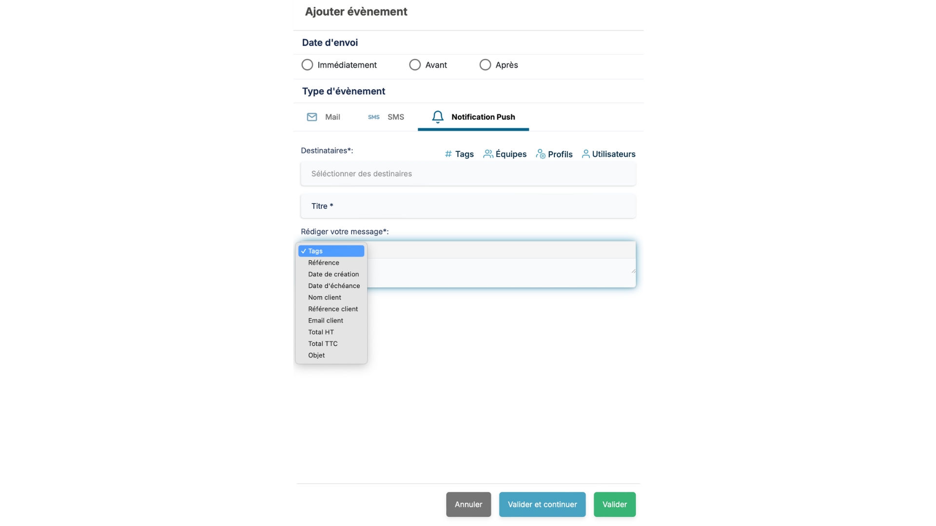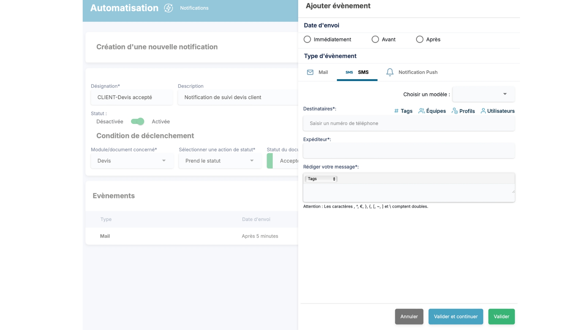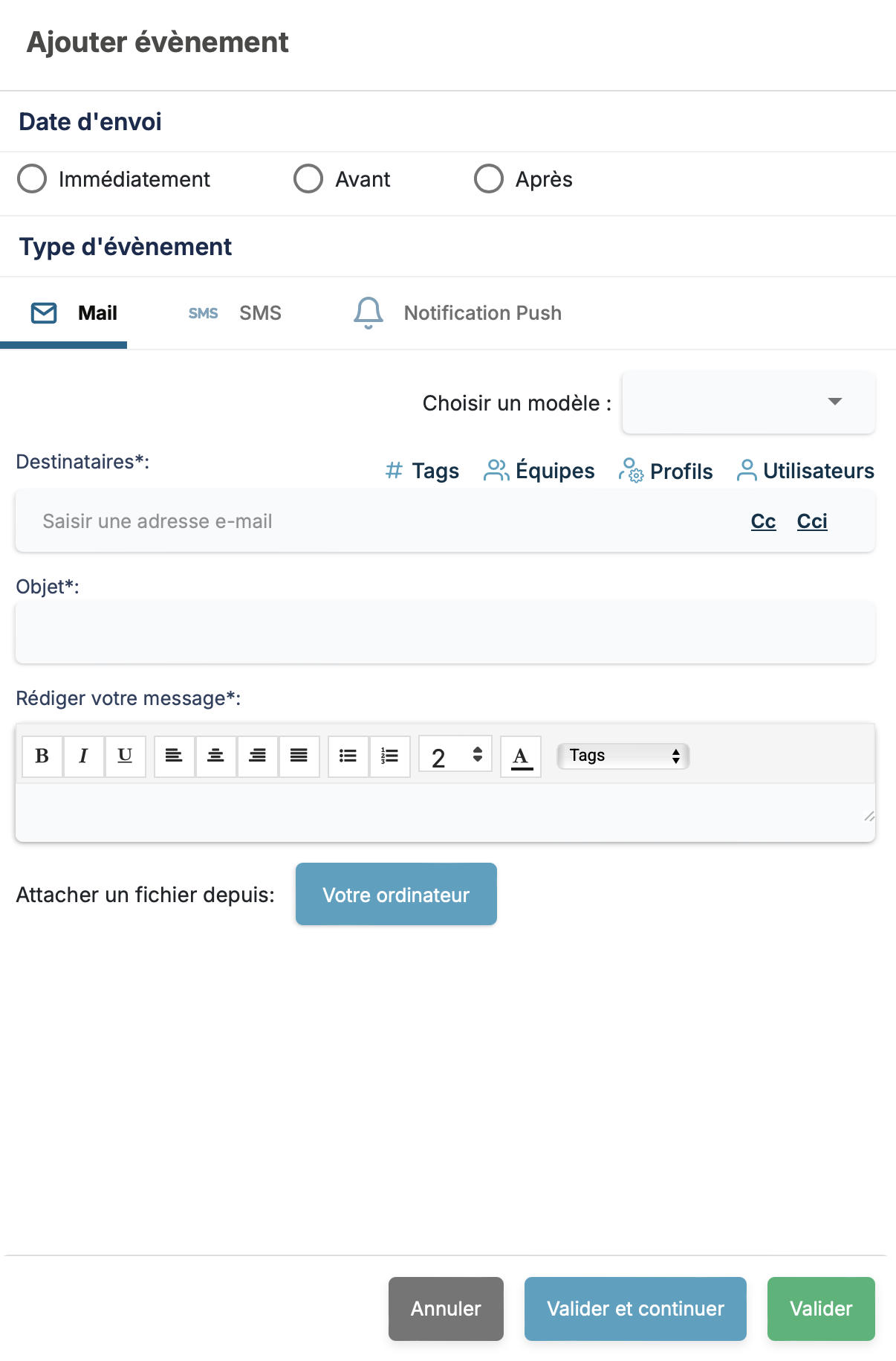 - SMS : Choisissez un modèle de SMS ou créez un SMS.