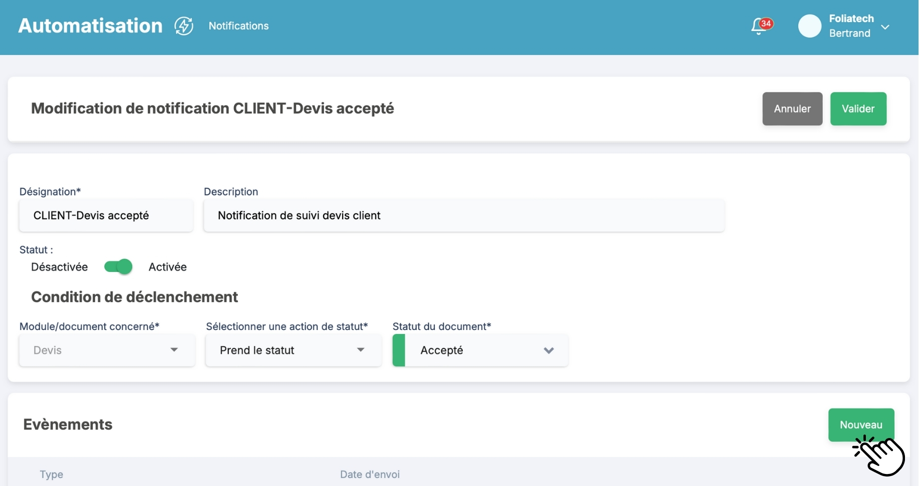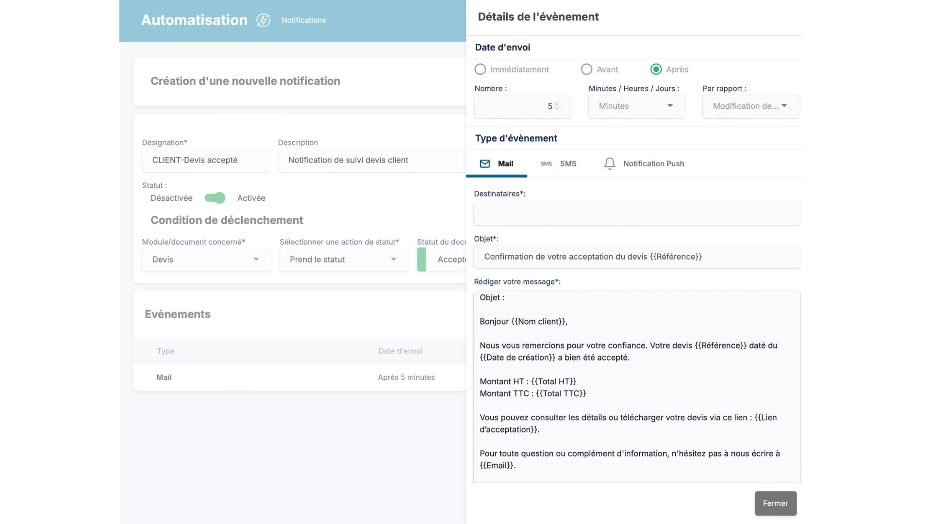 - Désignation : par exemple, « CLIENT - devis accepté » ou « TECH - rappel intervention »