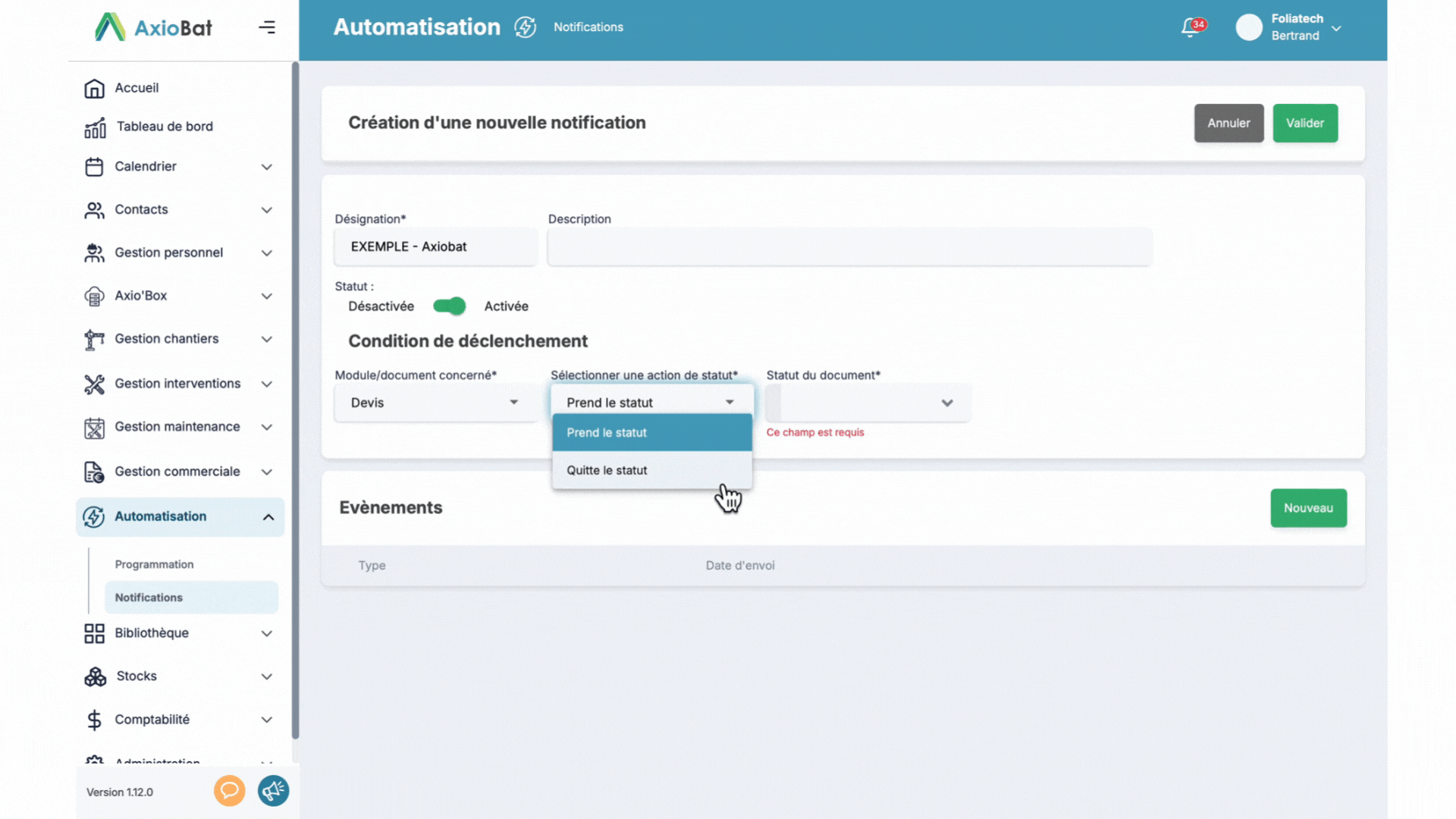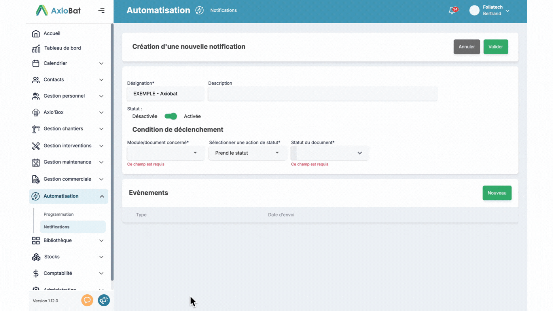 Module ou document concerné : Sélectionnez le module ou document cible d’Axiobat concerné par les notifications.