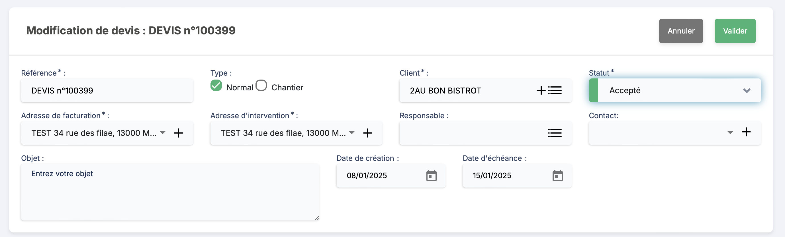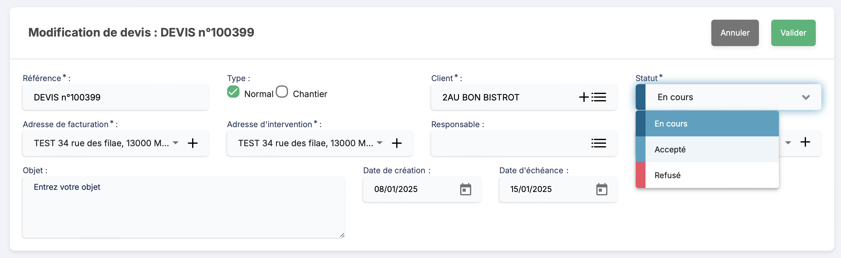 [Coordonnées de l’entreprise]Dans cet exemple, nous allons modifier manuellement le statut de notre devis pour le définir sur "Accepté".