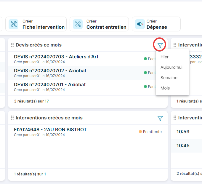 - À noter qu'un filtre est disponible sur certaines cartes, vous permettant de les filtrer par période. Vous pouvez également déplacer les cartes en plaçant le curseur sur les six points à gauche de chaque carte et en les glissant à l'endroit souhaité.