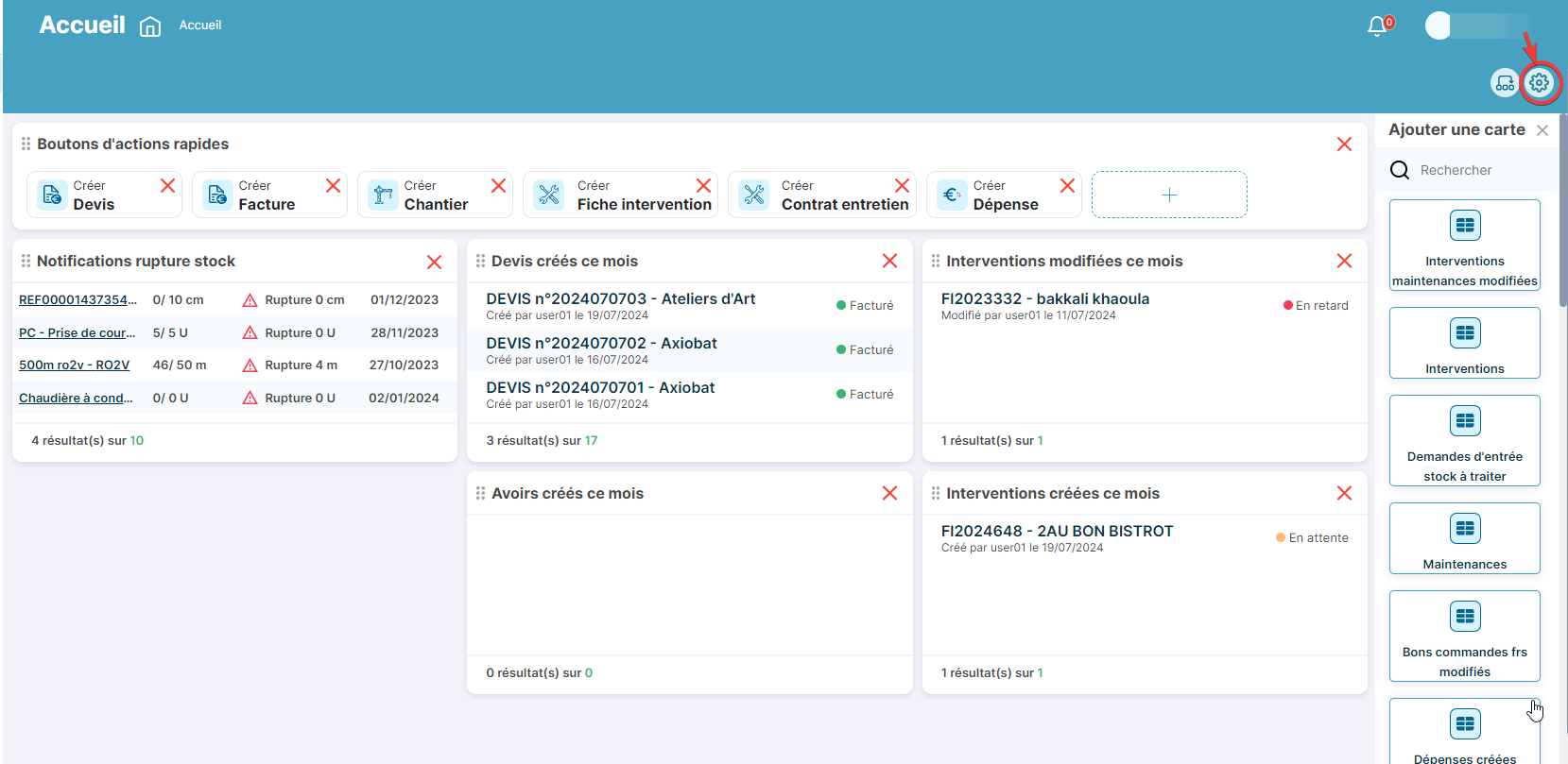 - En dessous, de nombreuses cartes sont disponibles et leur affichage est entièrement modulable. Vous pouvez donc choisir les cartes à afficher, les placer où vous le souhaitez et dans l'ordre qui vous convient.