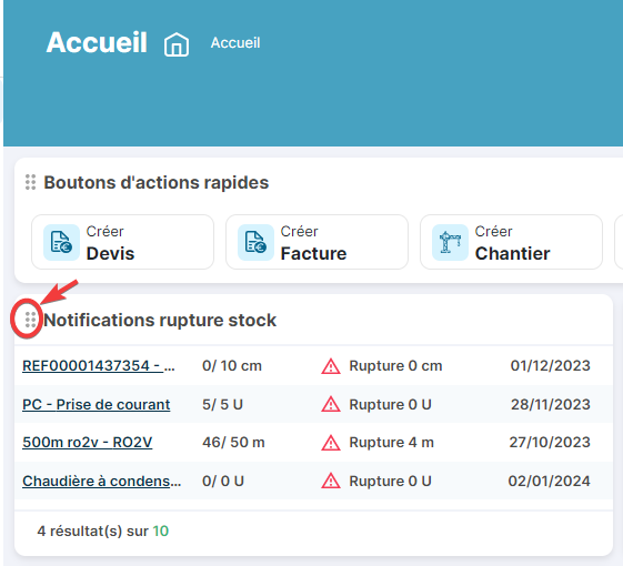 - Une Rubrique "Accueil" est Ajoutée offrant une vue plus claire de vos documents créés, modifiés ou en retard, ainsi que de vos tâches, chantiers, paiements émis, absences et autres.