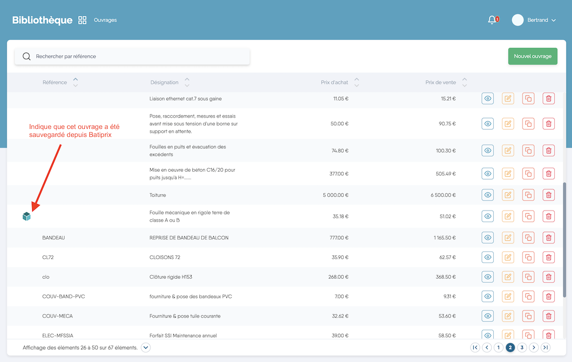 Vous pouvez identifier ces ouvrages facilement depuis votre bibliothèque d'ouvrages grâce au picto de Batiprix devant la ligne :