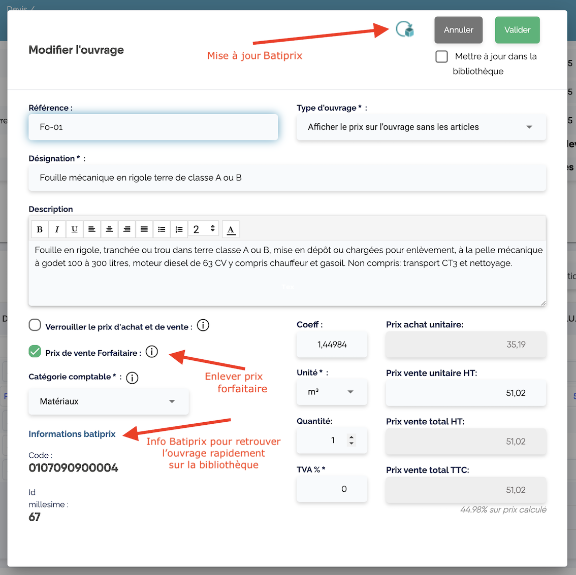 Notez aussi que la mise à jour va concerner seulement l'ouvrage dans le devis sauf si vous cocher l'option "Mettre à jour dans la bibliothèque" avant de valider.