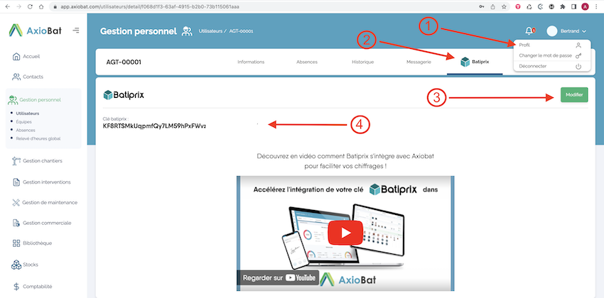 Seul l'utilisateur peut configurer sa clé sur son compte Axiobat en accédant à son profil.