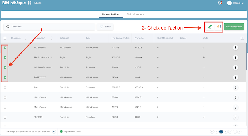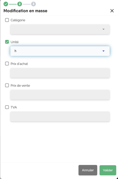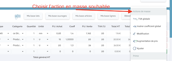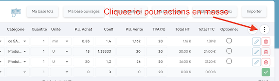 Les mêmes actions en masse peuvent réalisés depuis un devis ou une facture pour modifier rapidement les articles qui sont inclus dans un document. Ces changements n'impactent pas votre bibliothèque mais seulement les articles dans le document.