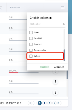 Si vous ne trouvez pas la colonne "Labels" sur votre liste, vous pouvez l'afficher en cliquant sur le bouton de choix des colonnes si cette liste supporte les labels.