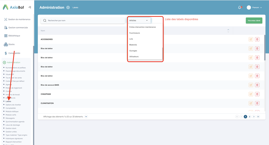 Vous pouvez consulter la liste des labels utilisés et les modifier depuis la section "Labels" dans le menu Administration :