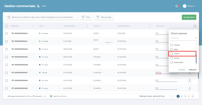 Pour l'activer, il suffit de cliquer sur le bouton de paramétrage des colonnes et cocher "Total HT" :