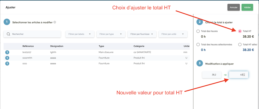 Par exemple, vous voulez avoir un HT de 1000€ au lieu de 935€ et vous voulez que les prix s'ajustent automatiquement au prorata sur une liste d'articles sans devoir modifier les articles 1 par 1.