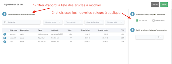 Vous pouvez filtrer vos articles sellons plusieurs critères pour ne garder que ceux qui seront ciblés par la modification. Tous les articles qui sont encore affichés sur la liste seront impactés par la modification quand vous cliquerez sur le bouton "Valider".