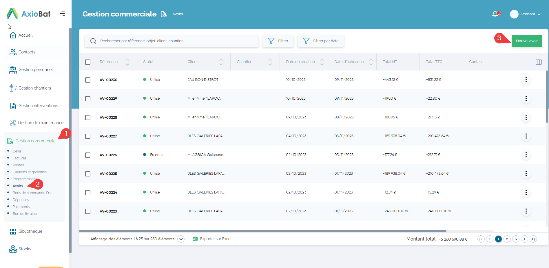 - Accéder à la section "avoirs". Cliquez sur "Nouvel avoir"